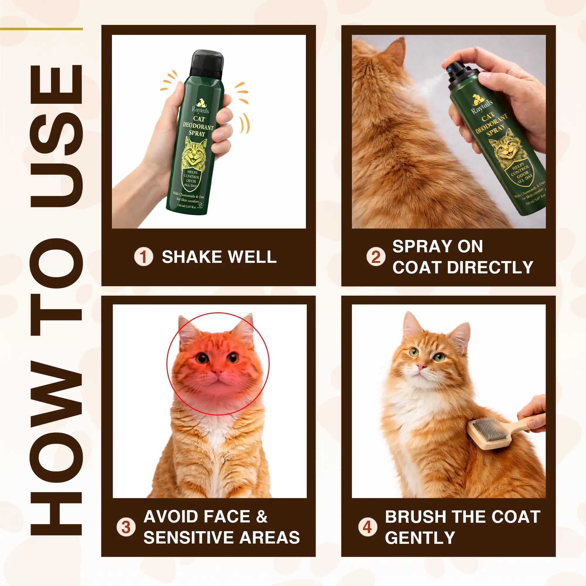 Spray lightly onto your cat’s coat from a safe distance. Avoid contact with eyes, ears, and nose. Gently brush or massage the coat for even distribution. Use as part of your regular grooming routine to maintain hygiene and freshness.