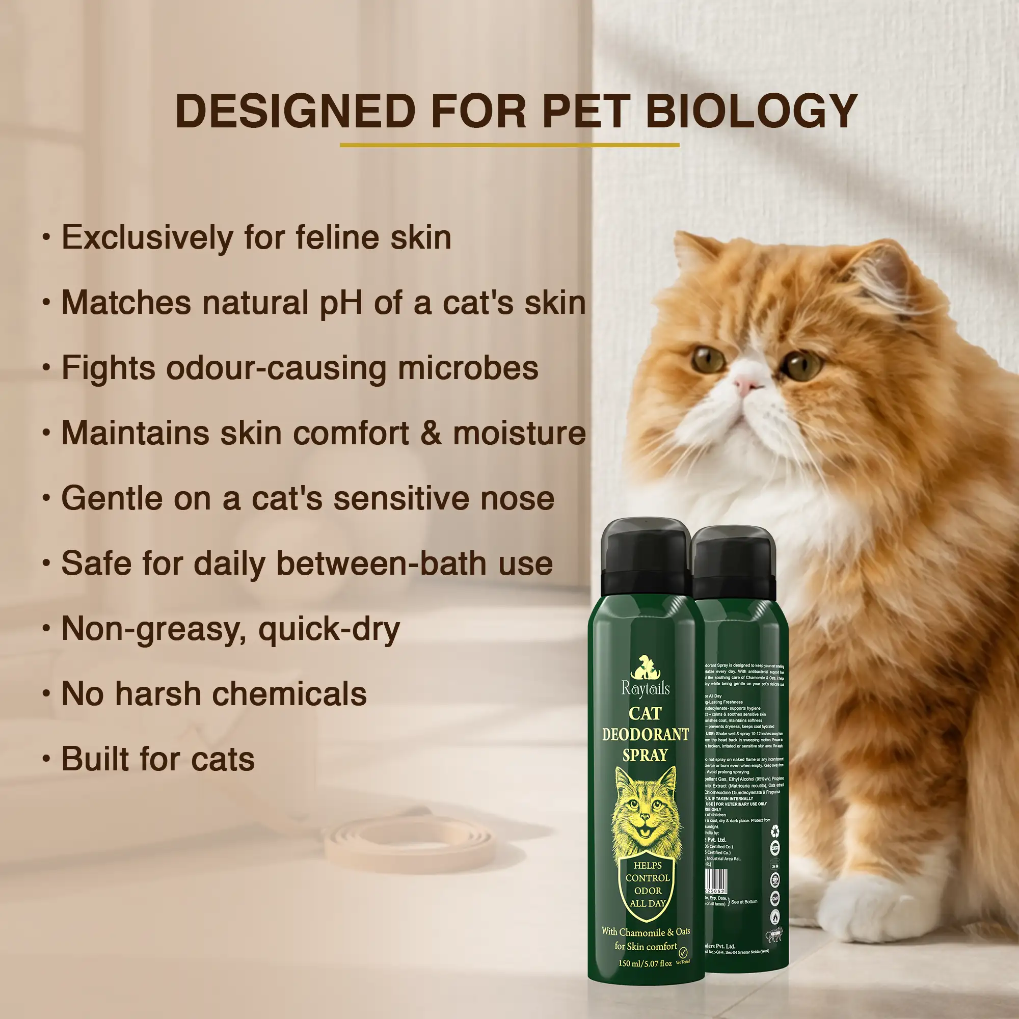 Cats have highly sensitive skin and unique self-grooming behaviour, making species-specific deodorants essential. A cat-formulated deodorant helps control odour gently, without interfering with the skin barrier or grooming habits. Proper formulations focus on freshness with comfort and safety, especially for frequent-use situations.